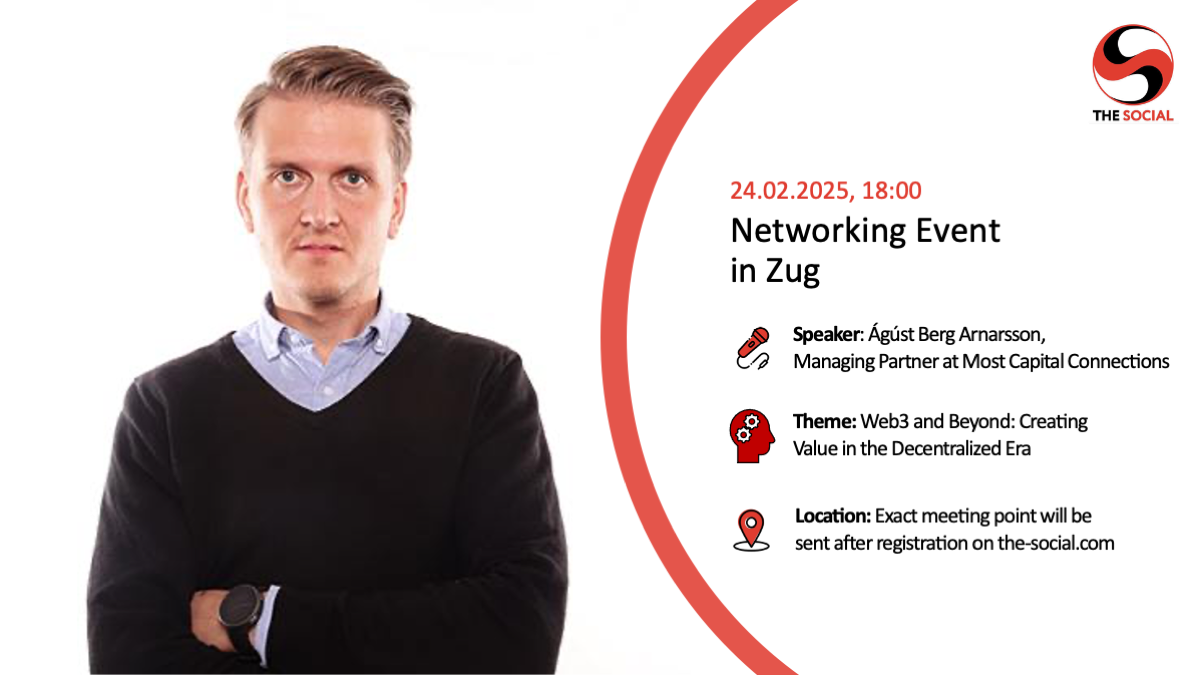 Zug Networking Event in Zug 24.02.2025 Posted by superadmin 26/02/2025 On 06/02/2025 Physical networking event in Zug on February 24. Speaker: Ágúst Berg Arnarsson, Managing Partner at Most Capital Connections Theme: Web3 and Beyond: Creating Value in the Decentralized Era Location: Zug, Switzerland