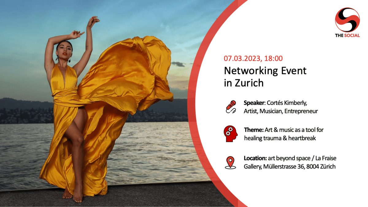 Zurich Networking Event in Zurich 07.03.2023 Posted by superadmin 19/08/2024 On 22/02/2023 Networking event in Zurich on March 7, 2023. Speaker: Cortés Kimberly, Artist, Musician, Entrepreneur Theme: Art & music as a tool for healing trauma & heartbreak Location: art beyond space / La Fraise Gallery, Müllerstrasse 36, 8004 Zürich