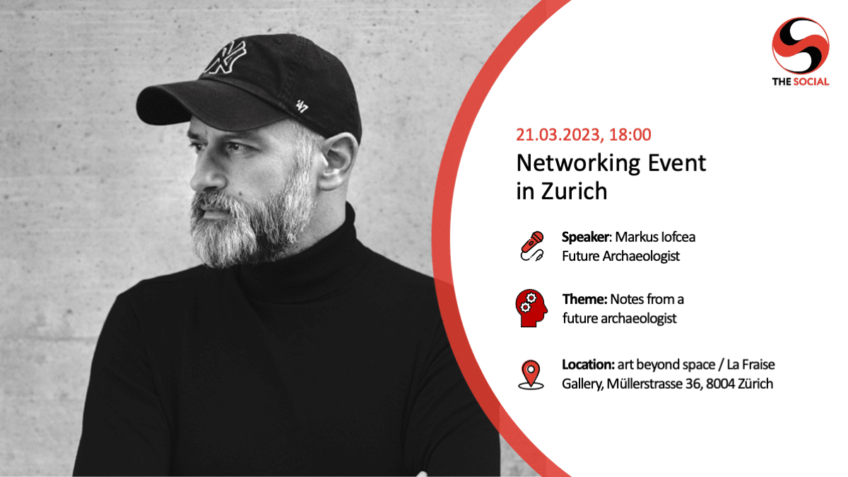 Zurich Networking Event in Zurich 21.03.2023 Posted by superadmin 19/08/2024 On 15/03/2023 Networking event in Zurich on March 21. Speaker: Markus Iofcea, Future Archaeologist Theme: Notes from a future archaeologist Location: art beyond space / La Fraise Gallery, Müllerstrasse 36, 8004 Zürich